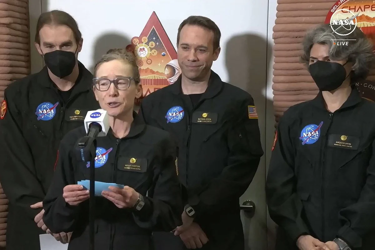 Anca Selariu, Ross Brockwell, Nathan Jones và trưởng nhóm Kelly Haston bước ra trong tiếng hò reo của mọi người. Họ đã dành 378 ngày bị nhốt bên trong môi trường sống "sao Hỏa" nhằm phục vụ cho nghiên cứu của NASA về những điều cần thiết để đưa con người lên hành tinh đỏ.