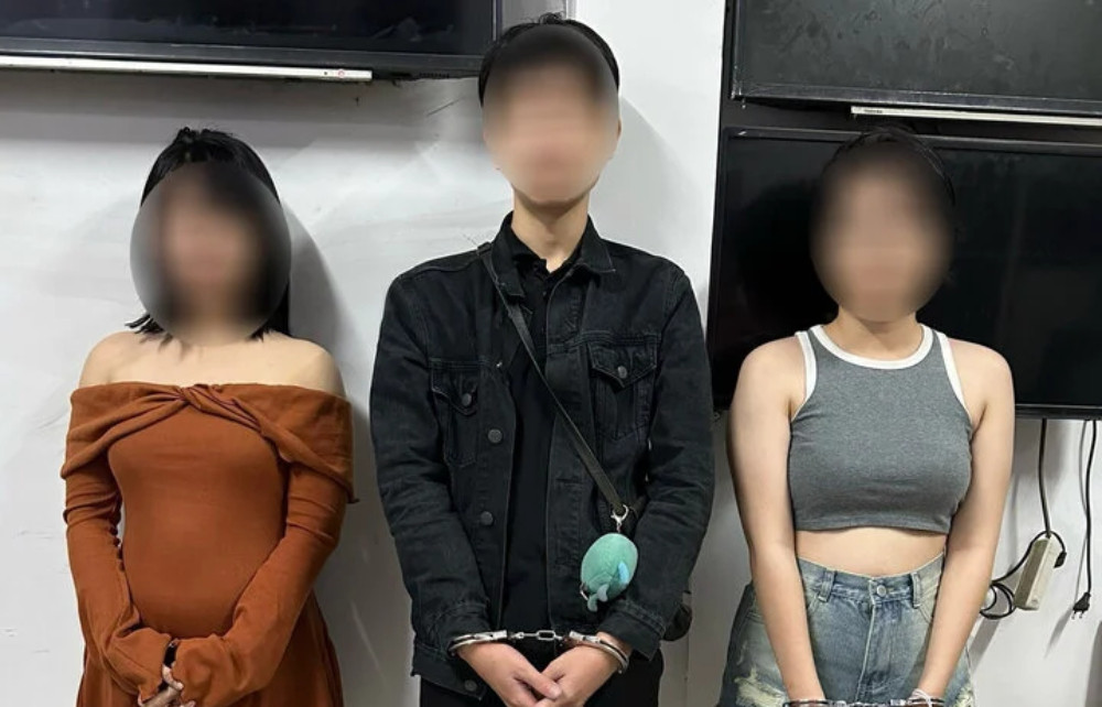 Thiên Nhi, Quốc Doanh và N.K.A. (từ trái qua) tại cơ quan điều tra.