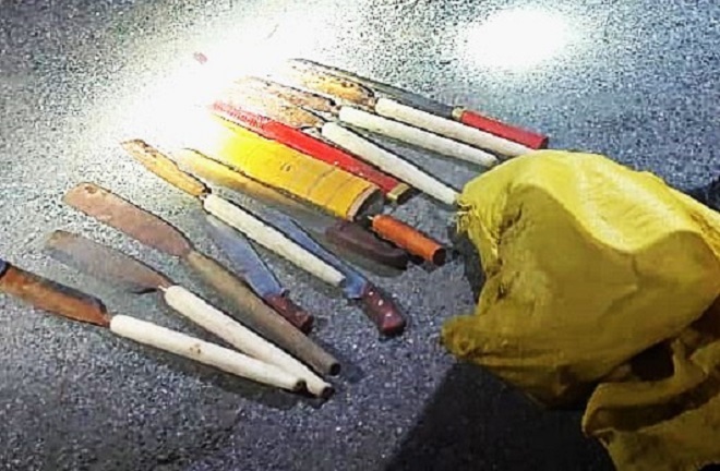 Qua kiểm tra, công an phát hiện trong bao tải chứa 8 con dao lở, 1 cây kiếm và 1 vỏ kiếm, 3 cây đao.