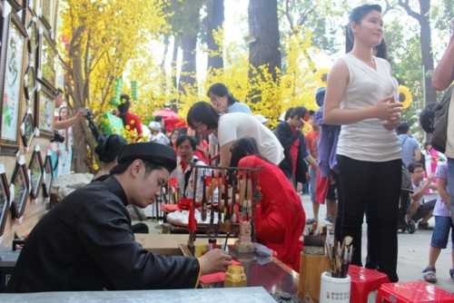 Sáng 8/2, trước cổng khu văn hóa Thanh Niên đã đông kín người dân đến dạo phố Ông đồ và chụp hình lưu niệm. Nhiều gia đình dẫn theo con nhỏ, các bạn trẻ Sài Gòn cũng quây quần bên những quầy trưng bày thư pháp nơi có những "ông đồ, bà đồ" bày giấy đỏ, mực tàu viết thư pháp.