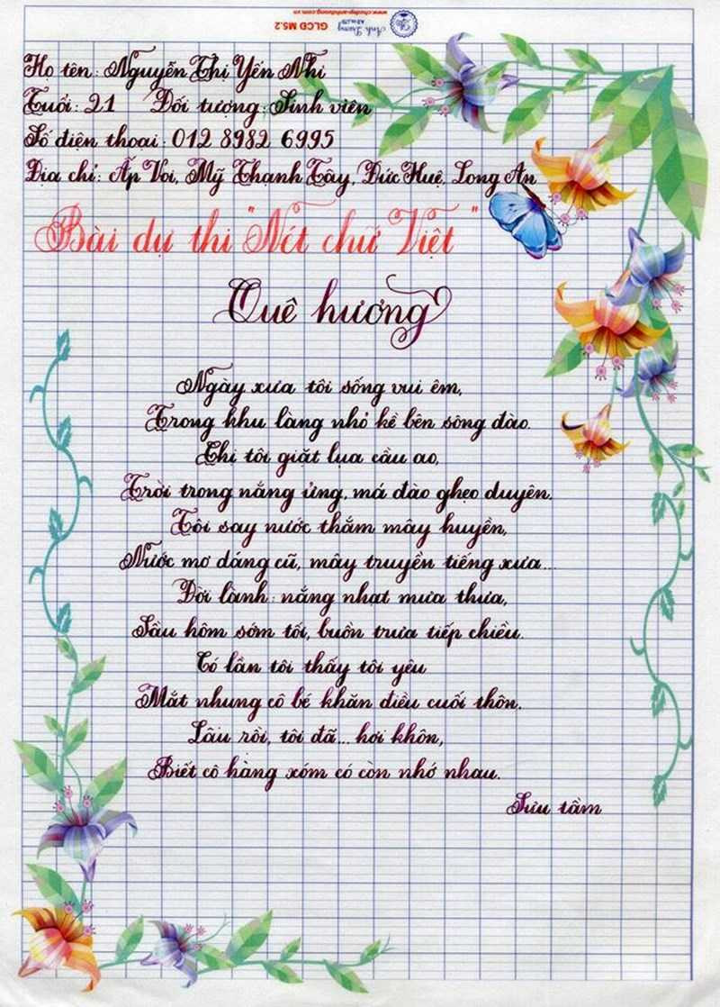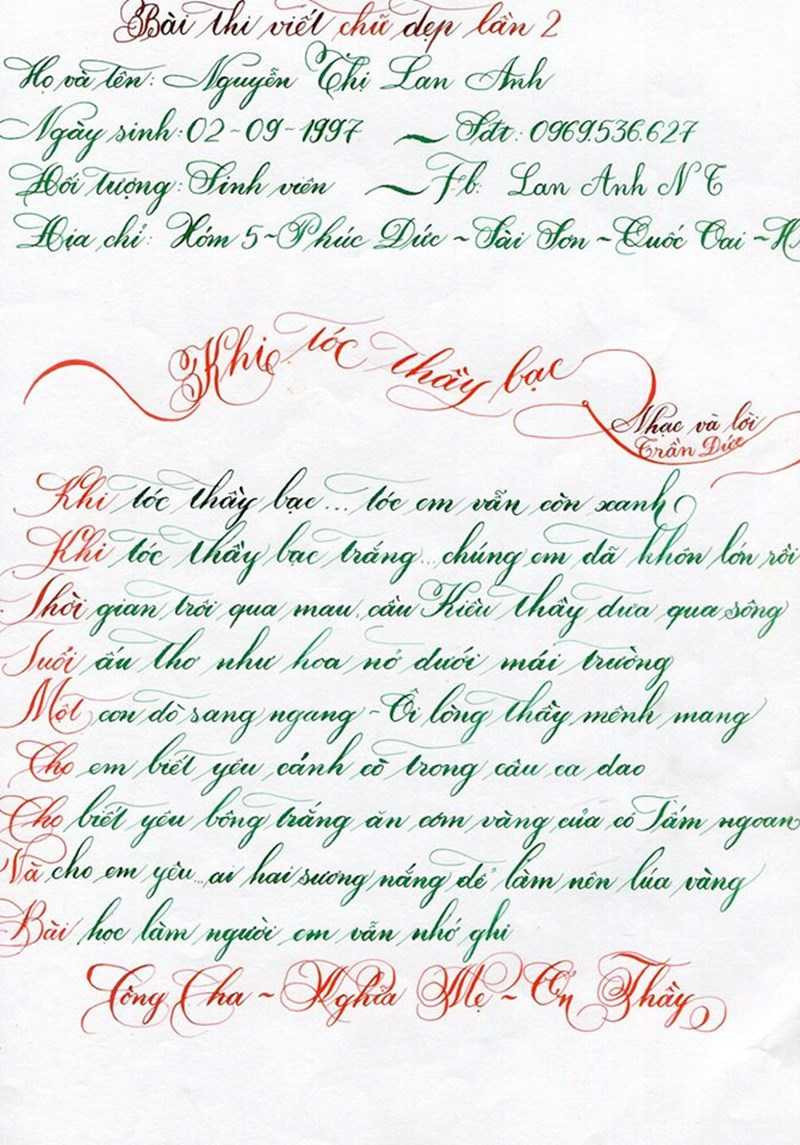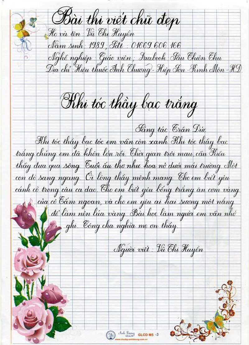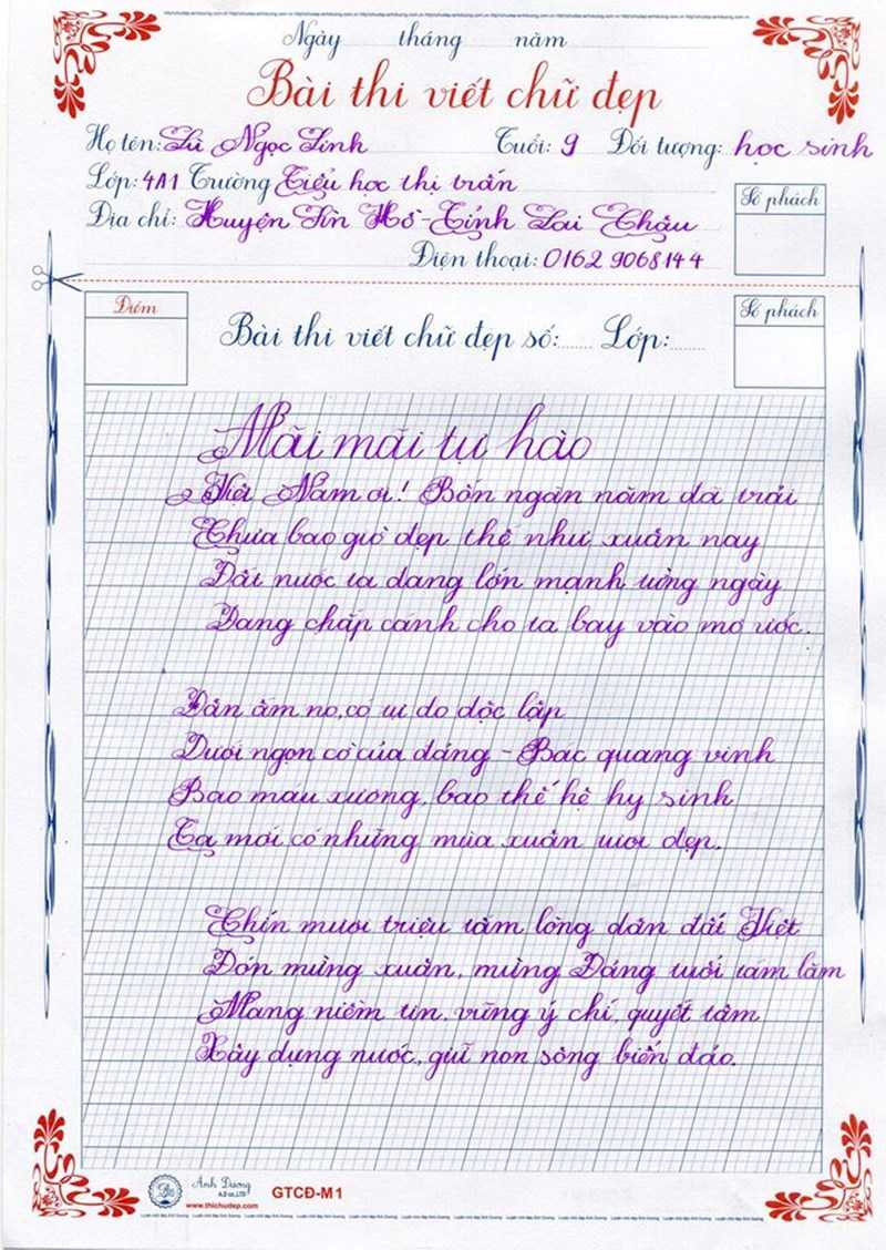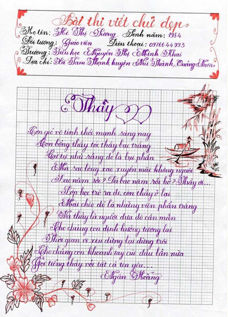 Các bài thi viết chữ đẹp sau đây được sưu tầm từ các cuộc thi viết chữ đẹp các cấp và cuộc thi “Viết chữ đẹp lần 2- do Group Nét Chữ Việt tổ chức”, “Viết chữ đẹp online”.