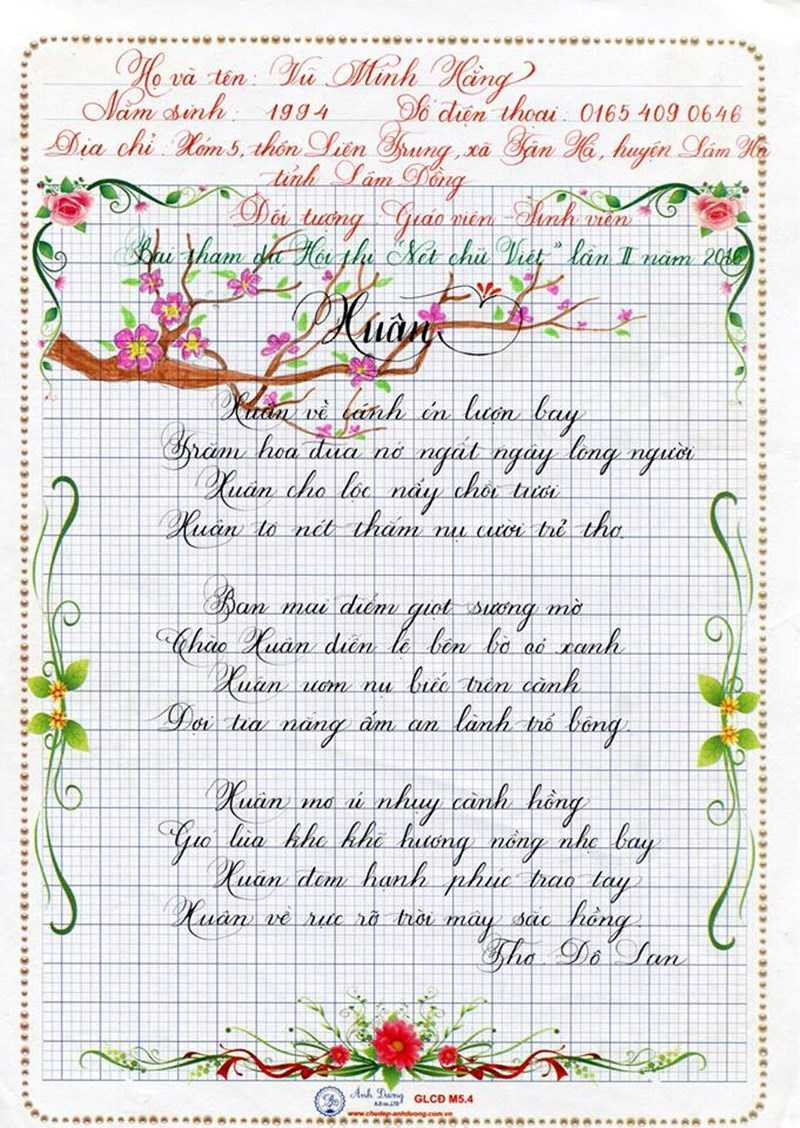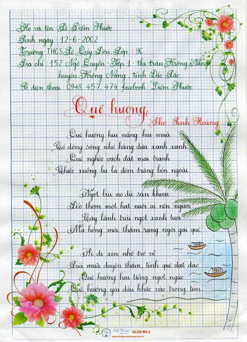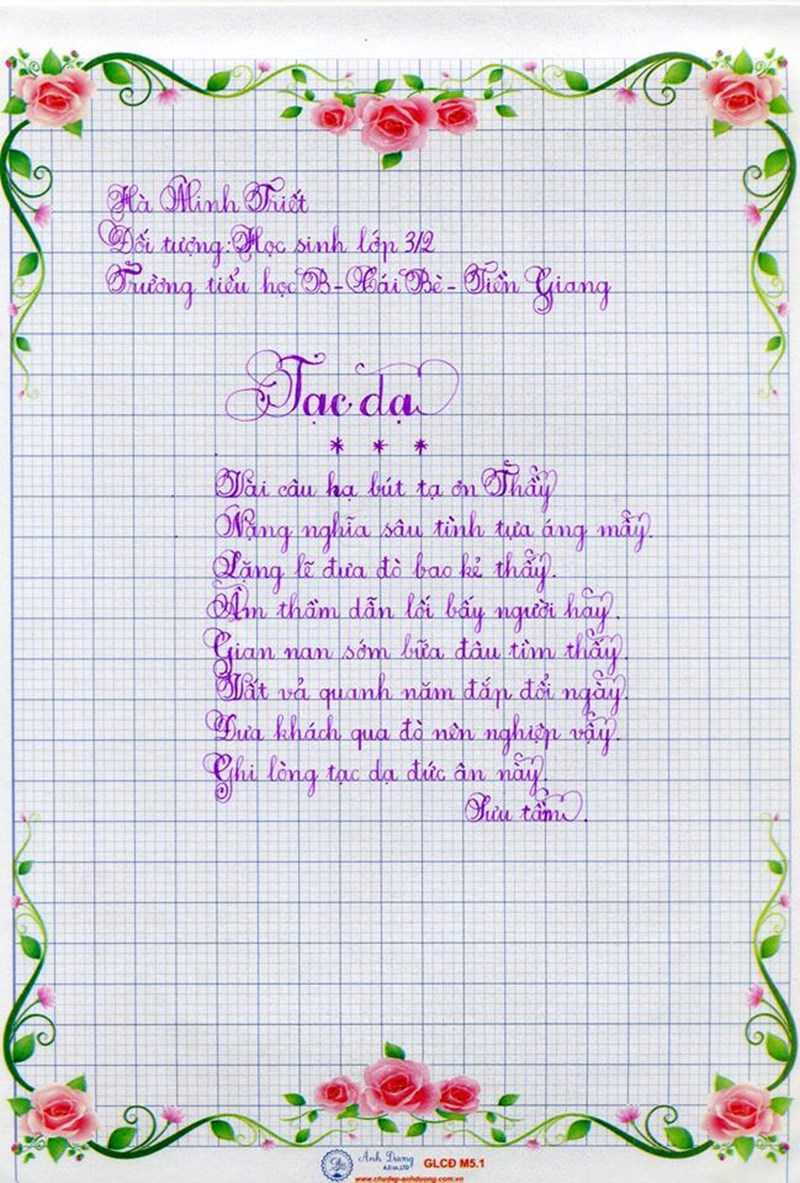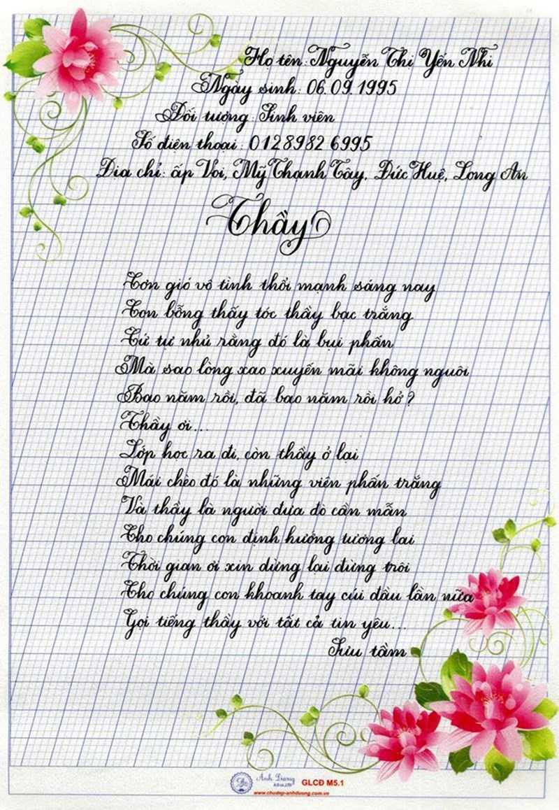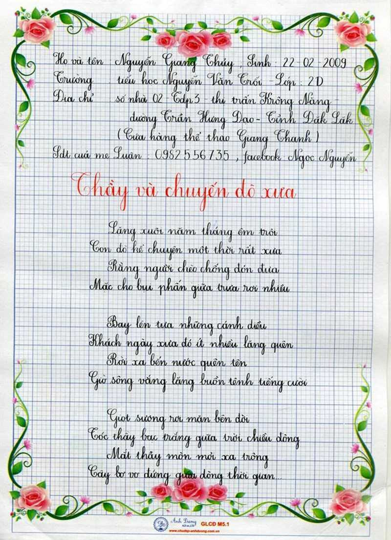 Các bài thi viết chữ đẹp sau đây được sưu tầm từ các cuộc thi viết chữ đẹp các cấp và cuộc thi “Viết chữ đẹp lần 2- do Group Nét Chữ Việt tổ chức”, “Viết chữ đẹp online”.