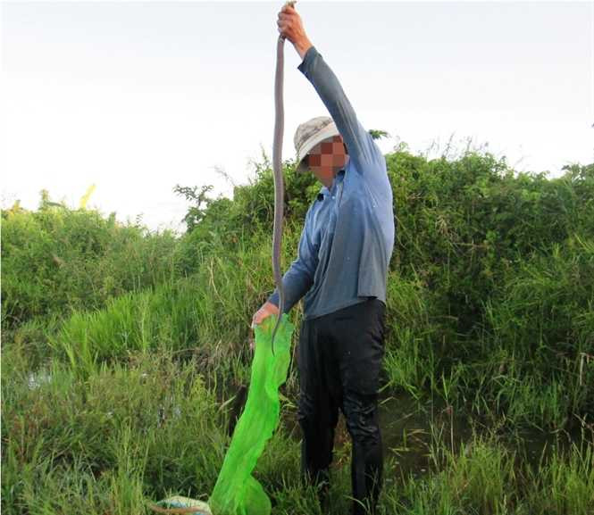 Lần này, tôi thấy anh khom mình lấy ngón tay búng vào sợi dây câu, bỗng nghe tiếng: “Chắc chắn cần này dính được con “đen” (rắn hổ đất). Như vậy, hôm nay rắn đi ăn nên thế nào bên kia cũng dính thêm vài con nữa”. Ngay lập tức anh lấy cây mác cắt dây câu trong chớp nhoáng rồi bỏ gọn con hổ chúa vào túi lưới.