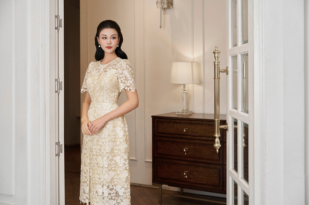 Điểm nhấn của đầm chính là họa tiết thêu kim tuyến tinh xảo, được thiết kế với phong cách cổ điển. Những họa tiết này được thêu tay tỉ mỉ, tạo nên vẻ đẹp lấp lánh và cuốn hút, làm nổi bật phong cách thanh lịch và quý phái. Họa tiết thêu kim tuyến cổ điển không chỉ mang đến vẻ đẹp vượt thời gian mà còn thể hiện sự tôn trọng đối với nghệ thuật thủ công truyền thống.