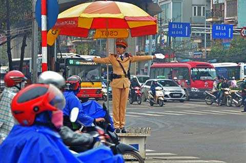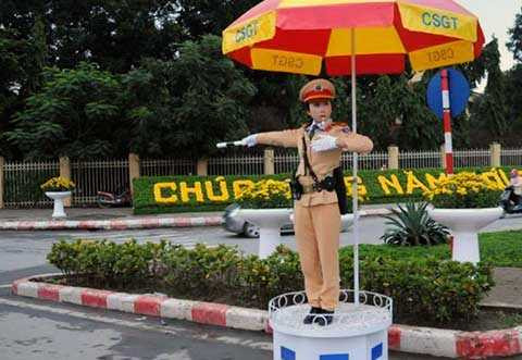 | Nhiều người dân đã dần quen với hình ảnh nữ CSGT đứng trên bục. |