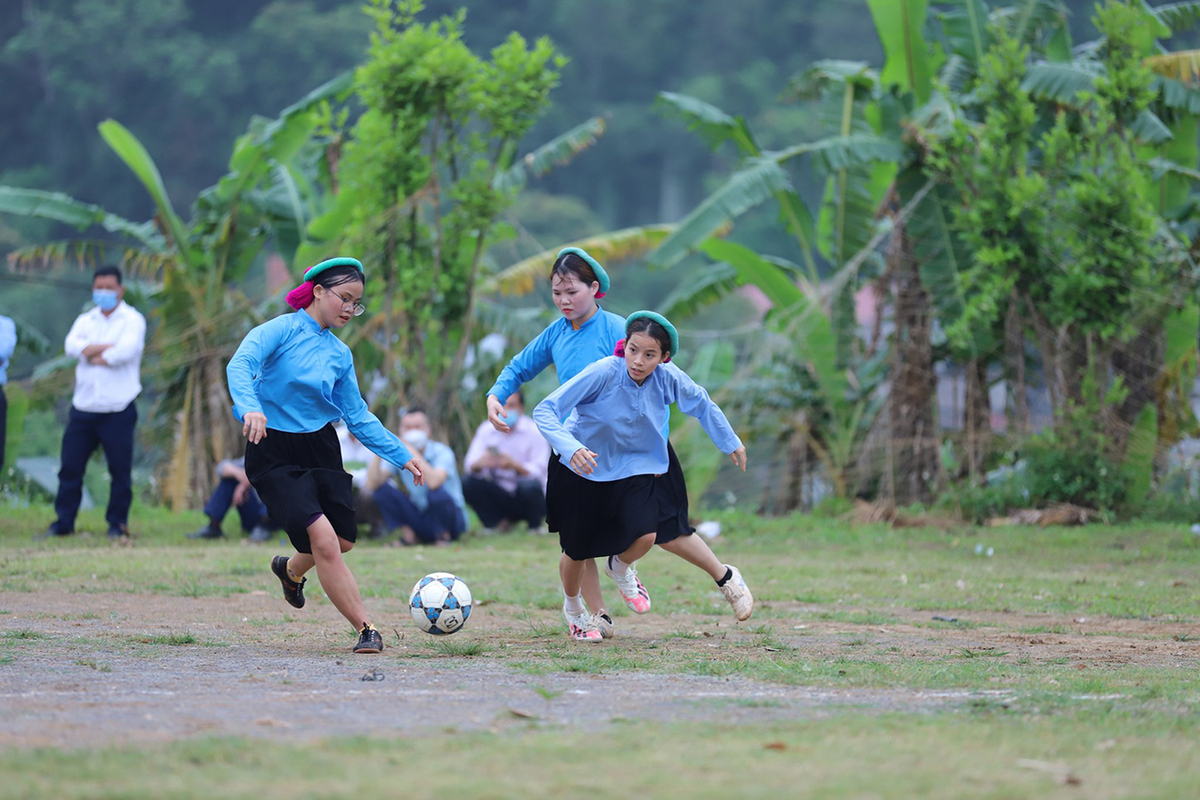 “Năm 2016, tại hội hát Soóng Cọ tháng Ba âm lịch, 4 đội của 4 thôn ở xã Húc Động tập hợp các chị em mặc quần đùi, áo số ra sân cỏ. Ngày ấy, chiến thuật còn hạn chế, chúng tôi đá bóng với tinh thần vì sức khỏe, vui là chính và chơi hết mình, cứ thấy bóng là chạy tới đá”, chị Kim cười, nhớ lại thời gian đầu làm quen với sân cỏ.