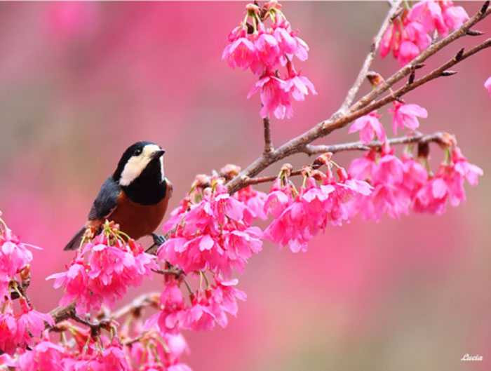 Chim vui chơi bên chùm hoa tươi thắm gợi tình yêu thiên nhiên