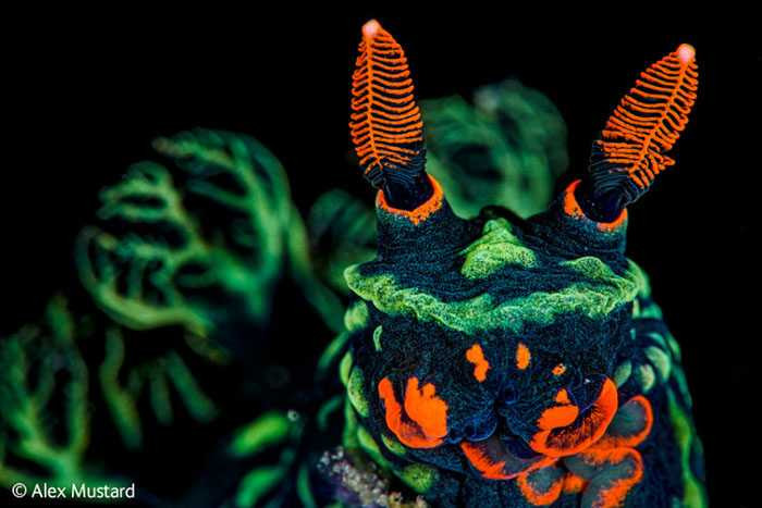 'You have been warned': Alex Mustar chụp bức ảnh này tại eo biển Lembeh ở Bắc Sulawesi, quần đảo Sunda của Indonesia. Sên biển – nhân vật chính của bức ảnh – có phần thân màu xanh và phần miệng màu vàng cam nổi bật, kích thước rất nhỏ (dưới 2cm), luôn luôn di dộng.
