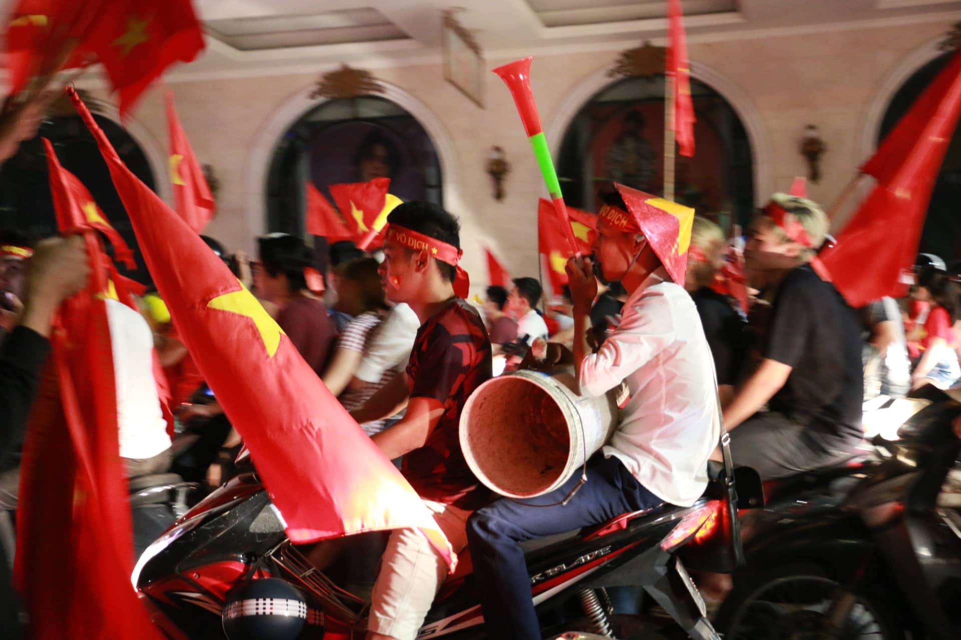 Ngay khi trận đấu kết thúc, hàng triệu người dân trên khắp mọi miền đất nước đổ ra đường ăn mừng chiến thắng. Tại Hà Nội, cổ động viên mang theo cờ, kèn, thậm chí cả...thùng sơn đổ xô lên khu vực hồ Hoàn Kiếm. (Ảnh: Tùng Lâm)
