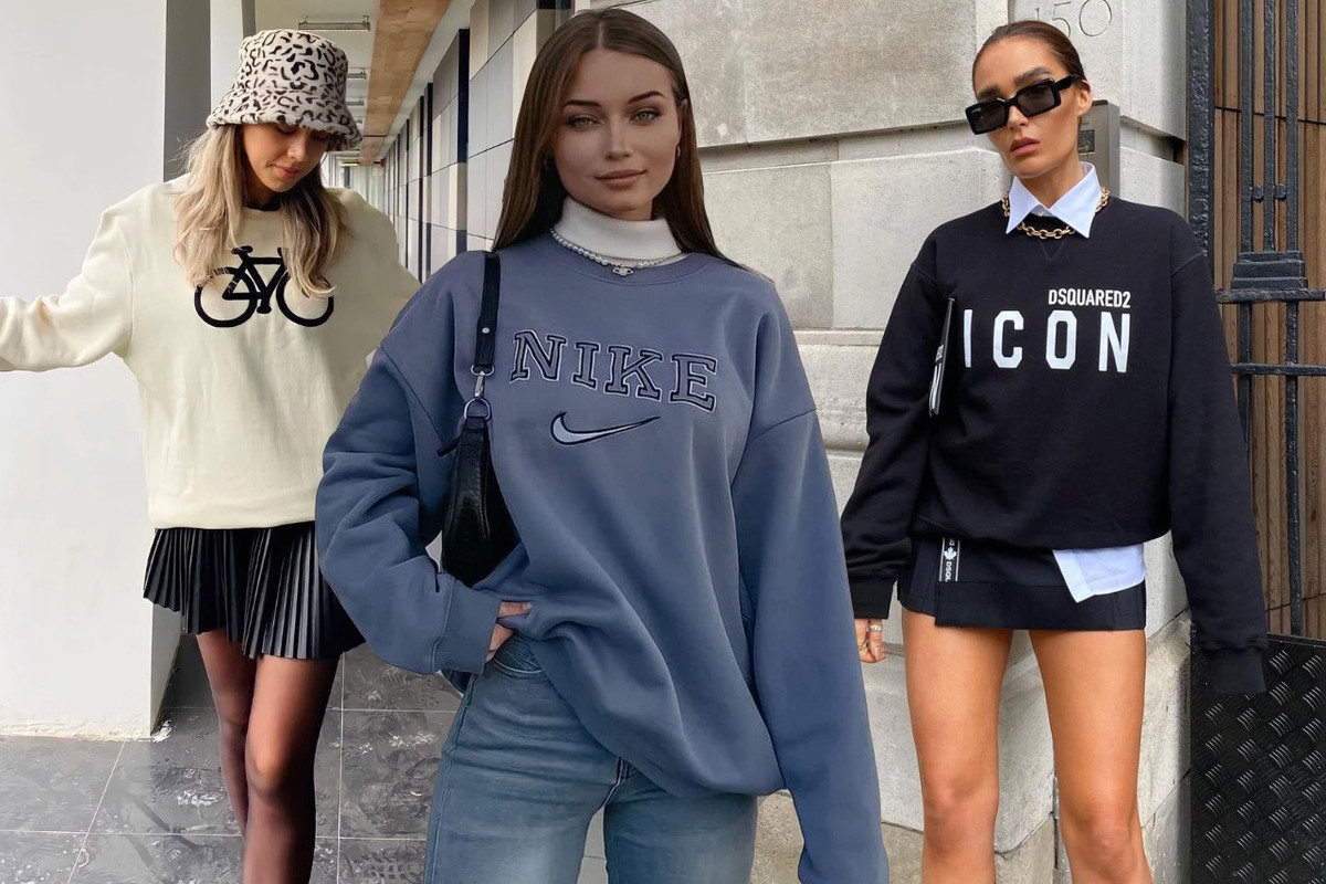 Những cô nàng cá tính và thời trang không thể bỏ qua kiểu mặc áo nỉ cùng quần shorts hay chân váy ngắn. Kết hợp với boots chạm gối để hoàn thiện phong cách.