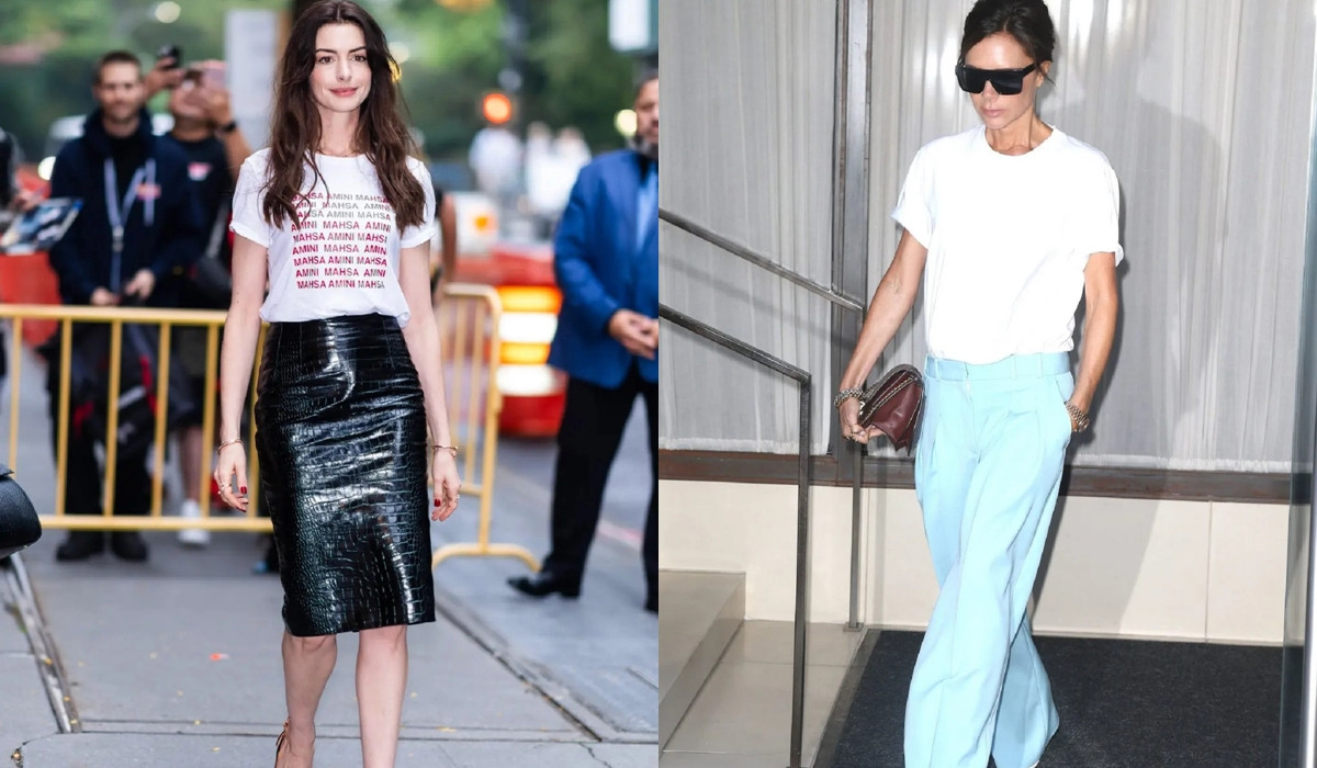 Áo thun trắng và quần vải thô màu be tuy đơn giản nhưng lại giúp phụ nữ có set đồ sang xịn mịn và trẻ trung để đi làm, đi dạo phố.