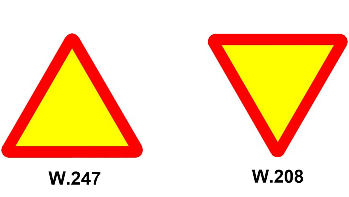 Biển báo đường ưu tiên và biển báo chú ý xe đỗ: Cả hai biển quy cách thiết kế là hình tam giác đều, viền đỏ, nền màu vàng, không có nội dung bên trong, nhưng chiều quay khác nhau.