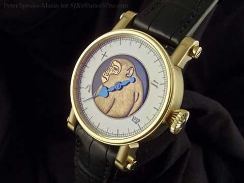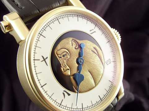 | Được chế tác bởi hãng đồng hồ nổi tiếng Thụy Sĩ Speake Marin, chiếc đồng hồ hình khỉ Speake Marin Shimoda Majestic Monkey được khách đại gia đặt hàng với phần mặt đồng hồ là hình khỉ vàng - tượng trưng cho cung hoàng đạo. |