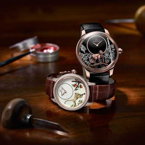 | Jaquet Droz: Mẫu đồng hồ sở hữu một mặt số ấn tượng với bề mặt sơn mài đen, đá onyx, vàng và xà cừ. Mặt đồng hồ là hình một chú khỉ được chạm khắc thủ công tinh tế từ vàng hồng. Đồng hồ có giới hạn chế tác 28 chiếc. |
