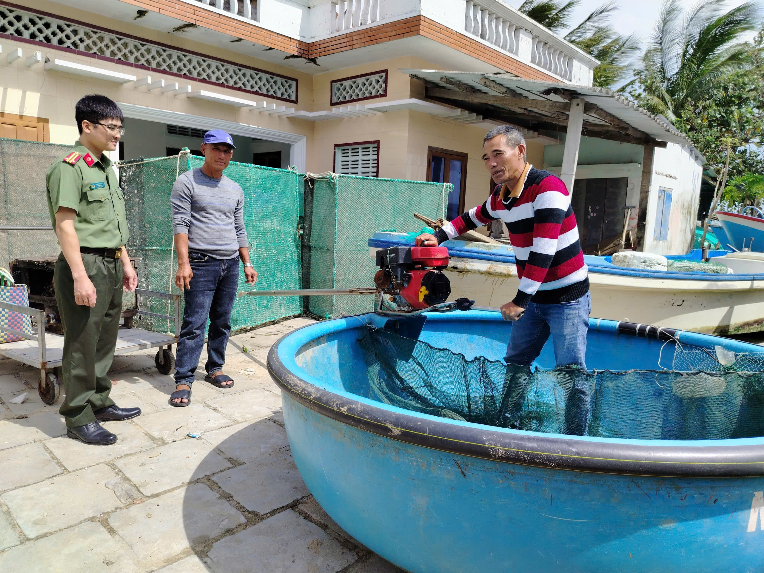 Ông Ban cùng đồng đội sử dụng thúng máy kết hợp xào dài để tiếp cận từng nhà. “Sóng nguy hiểm lắm, nhưng đưa bà con ra được là mừng,” ông nói.