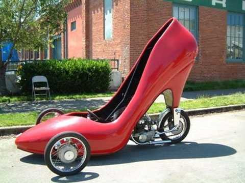15. Xe hơi giày cao gót: Chiếc xe này được lấy cảm hứng từ những đôi giày cao gót của phụ nữ. Động cơ và hệ thống khung được lấy từ xe Harley. Tay lái trên xe máy được thay bằng cơ cấu bánh lái tương tự ôtô. Xe được bố trí ba bánh với kiểu căm trên xe máy cổ điển.