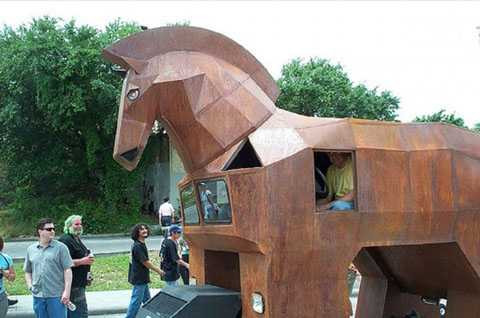 1. Xe ngựa Thành Troy: Mẫu xe hài hước này thuộc sở hữu của Larry Fullerton từ những năm 60 cho tới khi ông qua đời vào năm 1981. Nó đã dành được giải vô địch thế giới NHRA (giải đua xe drag) năm 1972 và thiết lập một kỷ lục thế giới vào thời điểm bấy giờ. Gần đây, chiếc xe đã được chỉnh sửa lại thành chú ngựa thành Troy theo đúng nghĩa đen. Toàn thân xe được bọc gỗ hình con ngựa, bên trong có ghế ngồi cho các hành khách.