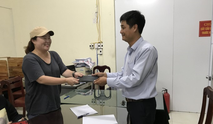 Đại diện hãng taxi Hàng Không trao trả chiếc ví cho nữ du khách Hàn Quốc.