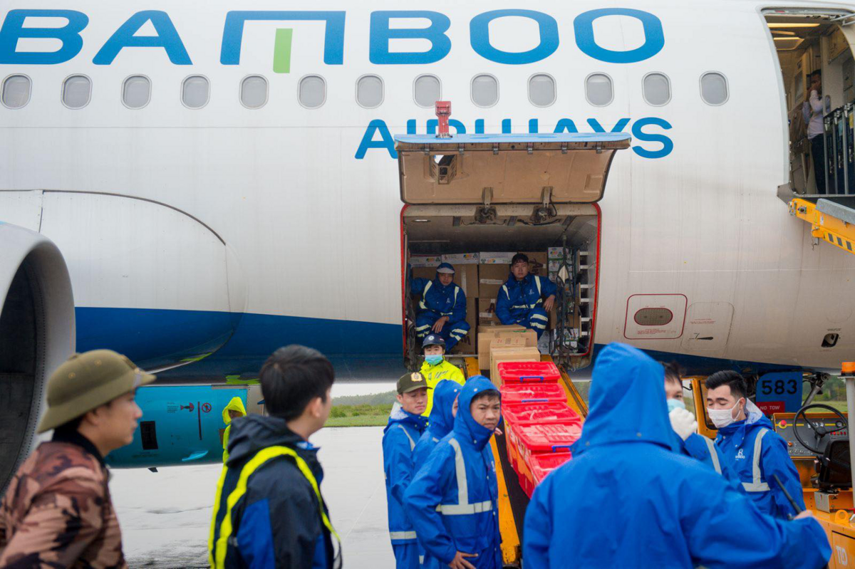 Chuyến bay của Bamboo Airways chở hàng hóa cứu trợ người dân miền Trung hạ cánh an toàn.