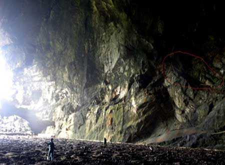 | Lòng hang Dơi hiện nay rộng hơn 1ha, với vách đá dựng đứng. Trên vách đá vẫn còn những cây mai của người đi leo hang để lại (chỗ khoanh trắng). |