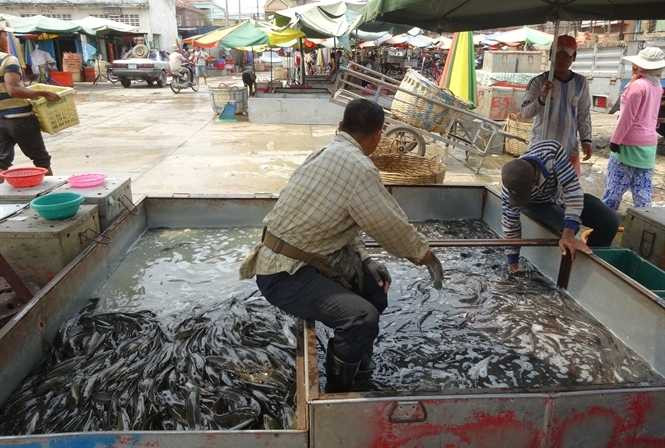 Từ đây, các sản vật vùng lũ gồm tôm cá cua ốc các loại tươi sống lẫn cá được nhốt trong những phuy nước sủi khí ôxy được vận chuyển khắp Campuchia.