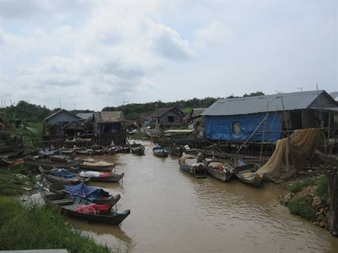 Sau 2 giờ ngồi xuồng, chúng tôi ra đến cửa sông đổ ra Biển Hồ. Trước mắt tôi là một không gian rộng lớn, nước mênh mông ngút mắt. Chạy thêm ít phút, ghe đến làng người Việt trên Biển Hồ.