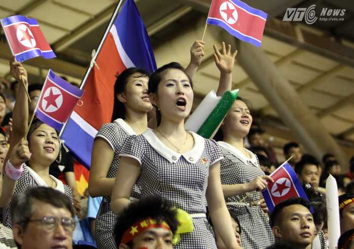 Có khoảng 30 CĐV Triều Tiên đến sân Mỹ Đình và trong số này lại có khoảng 10 cô gái xinh đẹp, mặc đồng phục, liên tục 'đốt cháy' một góc khán đài.