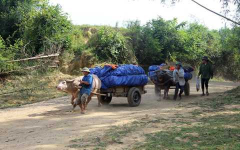 | Sau đó, một người dân trong làng nghĩ ra cách vận dụng sức mạnh của con trâu để kéo lúa băng qua sông. Lúa, lạc sau khi thu hoạch được chất lên xe bò lốp, dùng bạt nilon trùm kín. Mỗi xe nặng chừng hơn 300kg. |