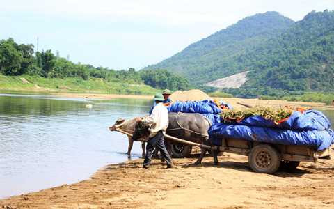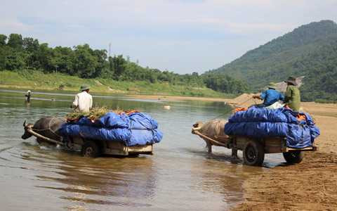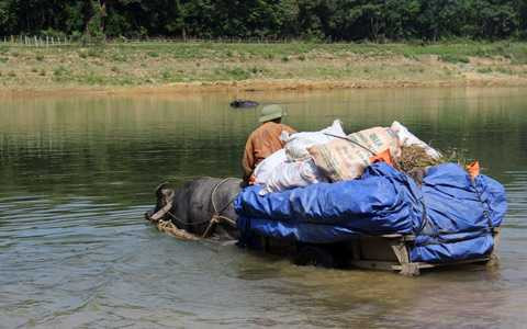Để vận chuyển lúa, lạc sau khi thu hoạch qua con sông Ngàn Sâu hung dữ, người dân xã Đức Liên (Vũ Quang, Hà Tĩnh) đã dùng bạt nilon bọc kỹ những bó lúa, bó lạc rồi chất lên xe bò lốp và dùng trâu kéo qua sông.