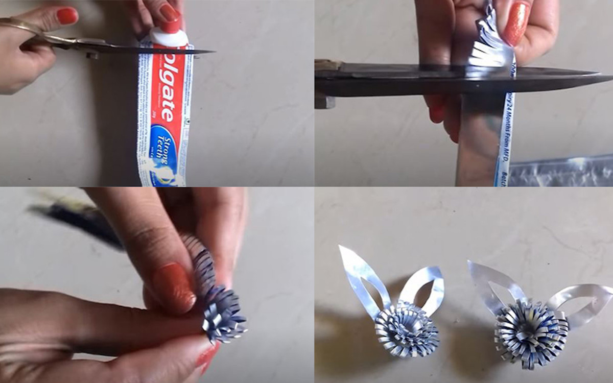 Làm đồ trang trí: Hoàn toàn có thể tái chế vỏ kem đánh răng thành những bông hoa xinh xắn để trưng trên bàn học, với các bước vô cùng đơn giản. Đầu tiên, rửa sạch vỏ kem đánh răng. Sau đó cắt phần nắp, phần đuôi và cắt dọc phần thân để biến vỏ kem đánh răng thành 1 tờ giấy bạc. Tiếp đến, gấp tờ giấy lại làm đôi rồi dùng kéo cắt dọc theo phần thân từng sợi nhỏ khoảng 0,5cm. Cuối cùng, khéo léo cuộn giấy lại tạo thành hình hoa. Sau đó cắt thêm vài chiếc nhỏ. Dán hoa và lá lại với nhau là tác phẩm của chúng ta hoàn thành.