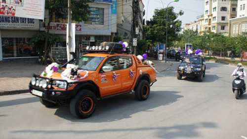 Tuy không quy tụ những chiếc siêu xe hay xe sang, nhưng đoàn rước dâu hùng hậu gồm 32 chiếc Mitsubishi Triton hầm hố được trang trí hoa và bóng bay xuất hiện trên đường phố Hà Nội hôm 4/10 vừa qua cũng đã gây sự chú ý lớn.