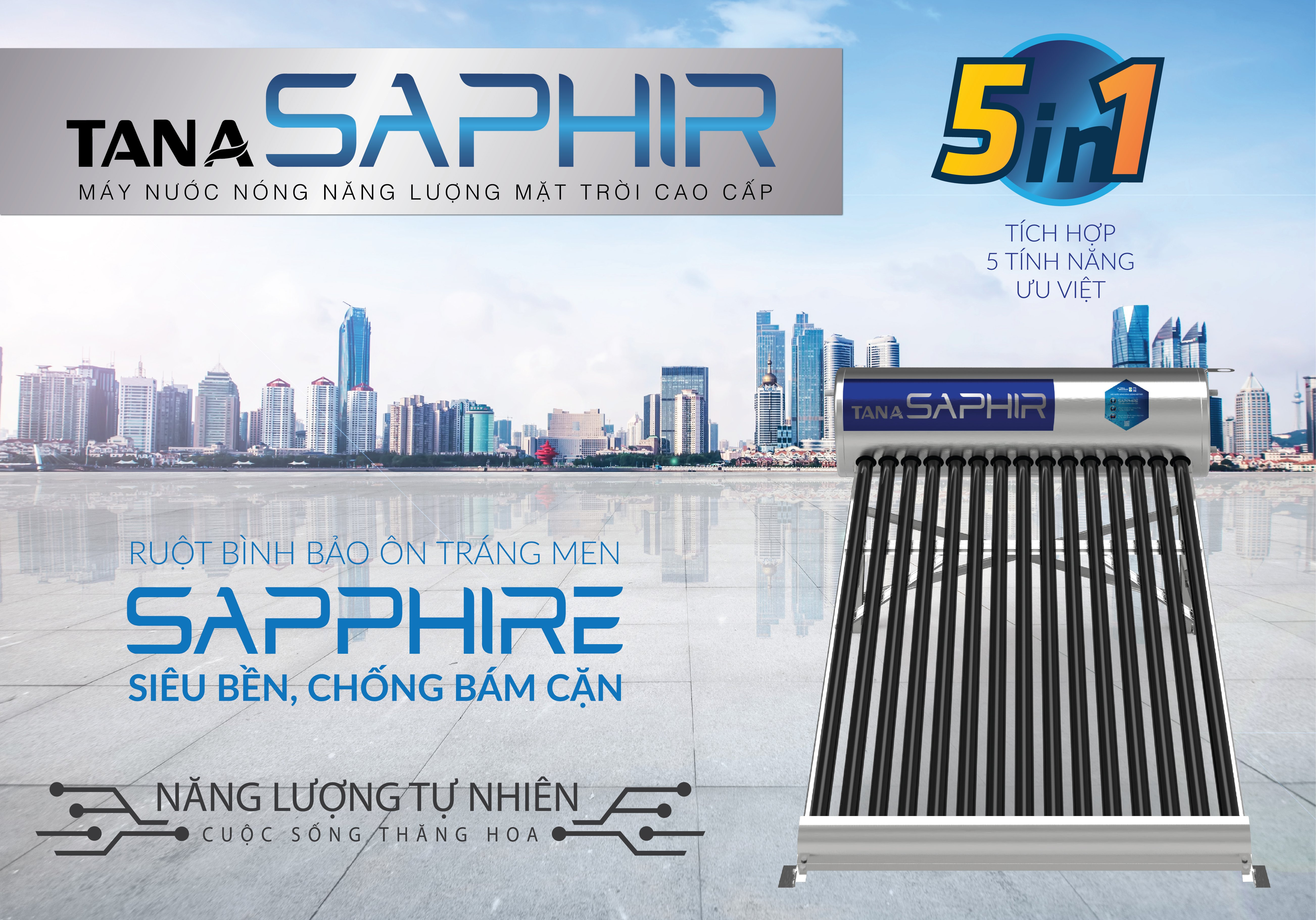 Máy nước nóng năng lượng mặt trời dòng Saphir của Tập đoàn Tân Á Đại Thành được sản xuất trên dây chuyền nhập khẩu đồng bộ của CHLB Đức, tích hợp 5 tính năng ưu việt: Ruột bình bảo ôn tráng men Sapphire nhân tạo siêu bền, chống bám cặn; Chân giá đỡ sử dụng kết cấu dạng định hình vững chắc, vật liệu inox siêu bền và dễ lắp đặt; Ống thủy tinh chân không 5 lớp, hấp thụ nhiệt tới 98%; Nguyên liệu bảo ôn được nhập khẩu từ Tập đoàn Dow - Mỹ; Sử dụng “năng lượng xanh” tiết kiệm tài nguyên và thân thiện với môi trường.