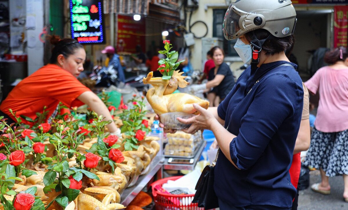 Người dân chọn mua gà cúng đã bày sẵn tại chợ. (Ảnh: Minh Đức)