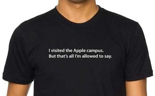 Một chiếc áo phông bán tại cửa hàng lưu niệm của Apple với hàng chữ: "Tôi đã đến thăm trụ sở Apple. Nhưng đó là tất cả những gì tôi được phép nói".