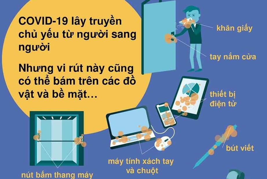 Theo Bộ Y tế, Covid-19 có thể lây nhiễm cho con người qua khăn giấy, tay nắm cửa, các thiết bị điện tử, nút bấm thang máy, máy tính xách tay hay bút viết.