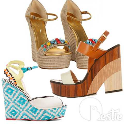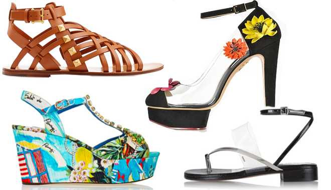 Kiểu sandals không bao giờ lỗi mốt có tác dụng tăng chiều cao và tạo sự chắc chắn khi đi lại. Để phù hợp với thời tiết ẩm ướt, bạn nên chọn loại làm từ cói, da trơn và tránh các kiểu da lộn, vải bởi chúng dễ ngấm nước và lâu khô, đặc biệt có thể hỏng sau khi đi mưa. Sandals thích hợp với đầm xoè, maxi, shorts...