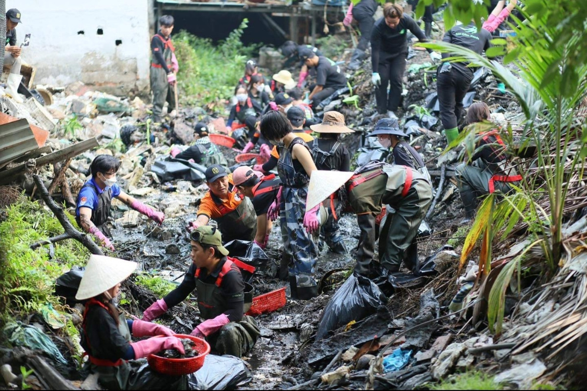 Nhóm bạn trẻ Sài Gòn xanh làm sạch rác tại một con kênh ở TP.HCM.