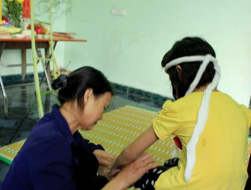 Ngôi nhà riêng của chị Phạm Thị Hương Giang ở thôn Thuận Tiến, xã Dương Xá (Gia Lâm, Hà Nội) cũng là trường mầm non tư thục. Ngoài sân, hai cô bé chít khăn trắng vẫn nô đùa với bạn, trong nhà không khí đậm đặc mùi khói hương lẫn tiếng kinh cầu siêu vang lên đều đều.