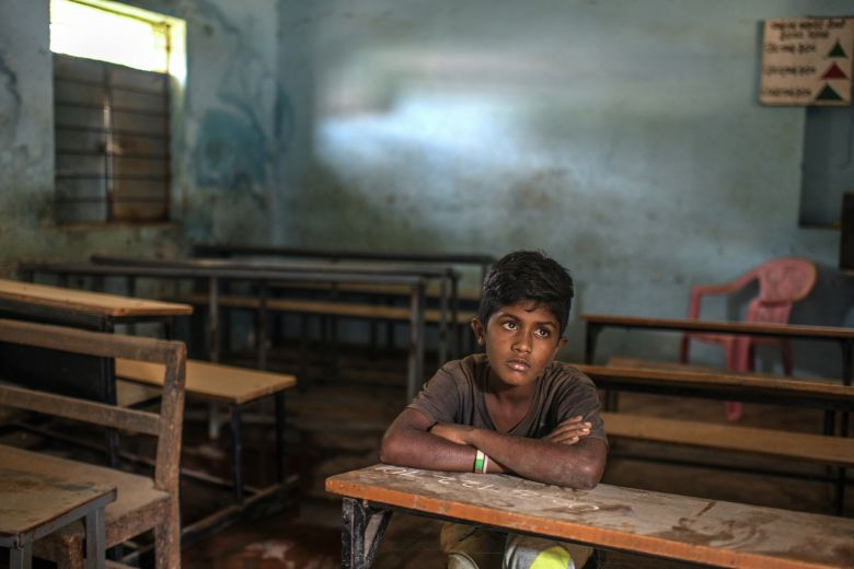 Rahul ngồi trong lớp học đã bị đóng cửa ở Tumakuru, Ấn Độ, ngày 11/9/2020. (Ảnh: NYTimes)