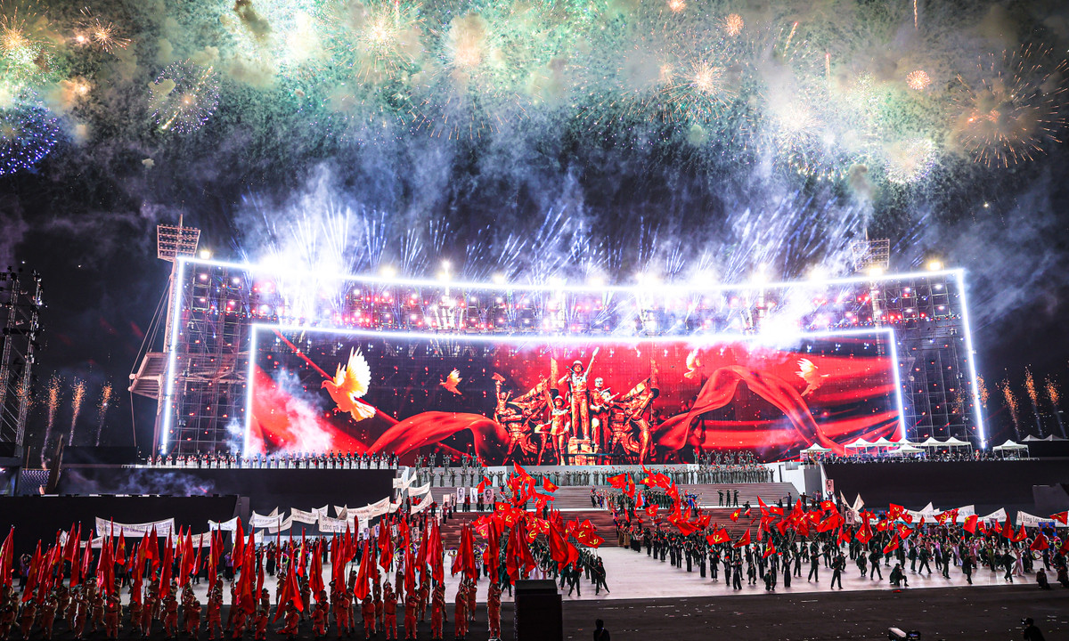 Một trong những hình ảnh nổi bật tại đêm tổng duyệt là sự tham gia của hơn 6.000 diễn viên quần chúng đến từ lực lượng vũ trang và sinh viên.