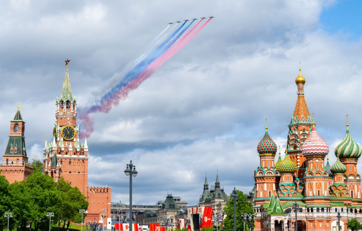 Các máy bay quân sự Nga phun khói màu cờ quốc kỳ trên Quảng trường Đỏ trong buổi diễn tập duyệt binh ngày 5/5 tại Moskva, Nga. (Ảnh: Xinhua)