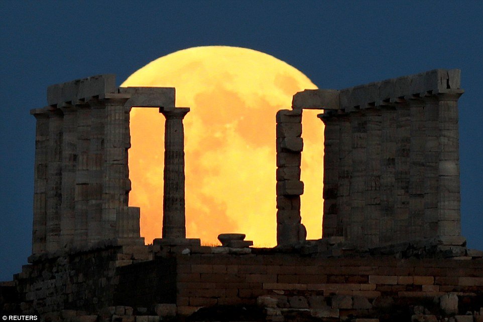 Trăng máu xuất hiện ở sau phía sau ngôi đền Poseidon, Hy Lạp. (Ảnh: Reuters)