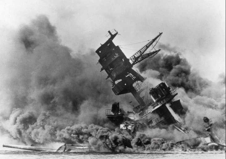 Khói và lửa bốc lên từ khu trục hạm USS Shaw sau đòn tấn công bất ngờ của Nhật Bản. Cuộc tấn công kéo dài gần 90 phút khiến hơn 2.000 lính Mỹ thiệt mạng và phá hủy số lượng lớn chiến hạm và máy bay của Washington.