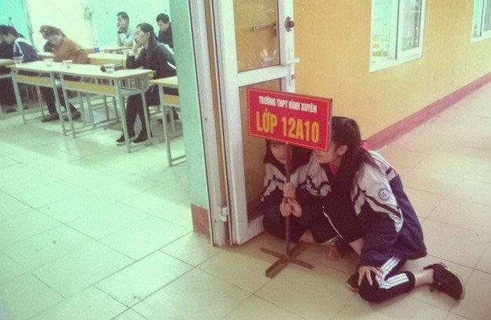 Hình ảnh hai bạn nữ hài hước cầm biển lớp, thậm thụt ngồi nghe lén cuộc họp.