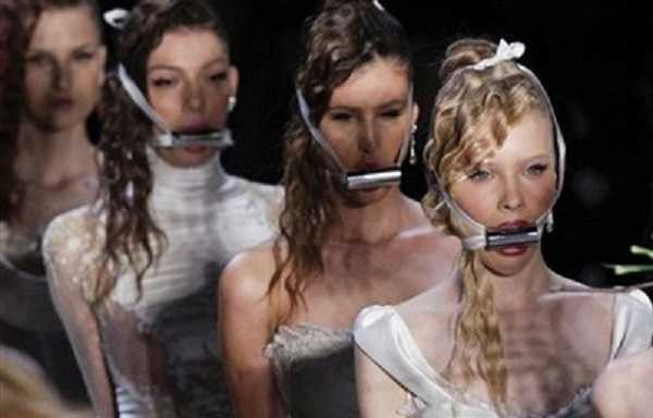 Trong những trang phục dạ hội và áo cưới sang trọng, tay người mẫu bị trói quặt ra đằng sau bằng những dải truy băng, các phụ kiện như hoa, ví, túi xách… sẽ được các người mẫu ngậm trên miệng.