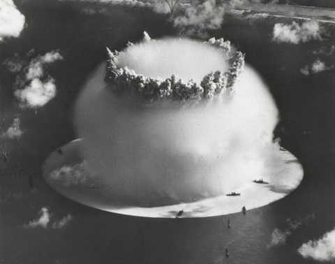 Đám mây hạt nhân được tạo ra sau vụ nổ, phần màu đen trong ảnh được các nhà quan sát tin là các chiến hạm Arkansas.