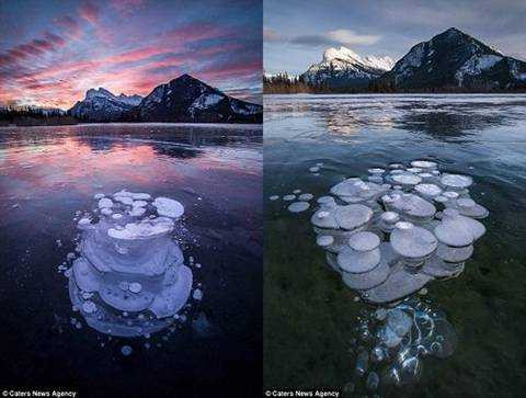 Năm ngoái, cư dân mạng ở Canada cũng ngạc nhiên với hiện tượng "sứa băng" độc đáo. Dưới bề mặt băng đông cứng có những chùm màu trắng nổi lên nhưng không vượt qua được lớp trên cùng.
