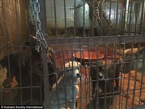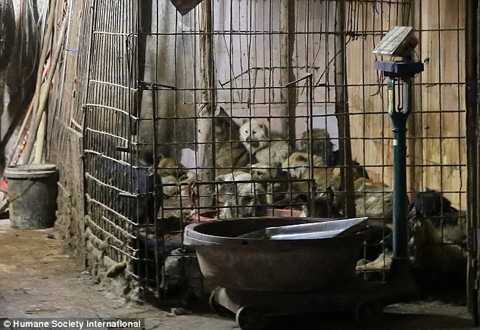 | Những chú chó đáng thương bị nhốt trong lồng sắt chờ tới lượt bị xẻ thịt. |