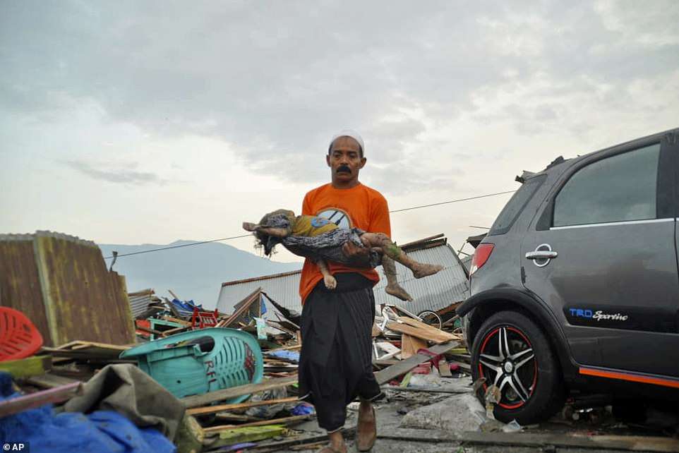 Một người đàn ông bế thi thể của một em nhỏ ra khỏi đống đổ nát sau trận động đất. (Ảnh: AP)