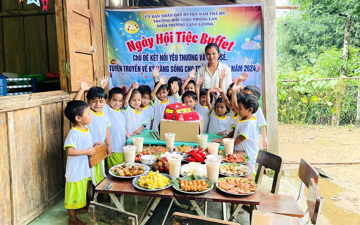 Theo đó, ngay khi kết thúc năm học 2023-2024, cô Trà Thị Thu - phụ trách điểm trường Lâng Luông - nơi có 16 trẻ mẫu giáo cùng 14 cháu lớp ghép 1 + 2, tổ chức tiệc buffet với chủ đề kết nối yêu thương và chia sẻ. Đây cũng là lần đầu tiên, các em học sinh nghèo ở nơi đây biết đến "tiệc buffet".